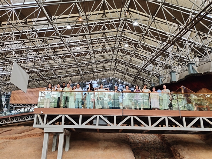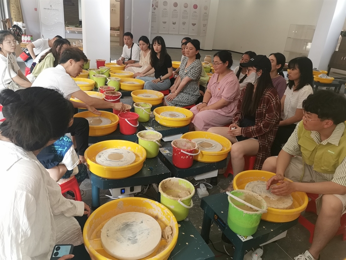 铜官是唐代陶瓷文化重要承载地,也是世界釉下多彩陶瓷发源地。首先组织大家观看了铜官古镇宣传片《陶城印象》,参观了铜官窑博物馆、谭家坡遗迹馆和陈家坪遗址,体会藏在瓷器里的长沙历史文化特质以及古代长沙劳动人民生活情景,感受千年陶城生生不息的力量。随后,大家在铜官陶瓷行业协会秘书长苏建伟的带领下,参观了铜官陶瓷“1+N”实践创新基地,聆听《实现铜官陶瓷振兴》微党课,感受铜官陶瓷的创新性发展,并近距离观摩学习制陶的基础技艺,亲身体验制陶乐趣和陶艺之美。