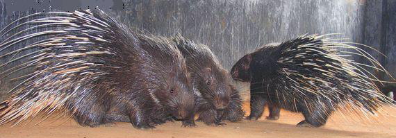 豪猪,又称刺猪或箭猪。属于哺乳纲、啮齿类、豪猪科的一种大型啮齿类动物。豪猪外形似鼠,体肥粗,头嘴有点像兔。体长56~77厘米,体重7~14千克。身体背面长有密密的长硬棘刺。头、颈和肩部的棘刺较为细短,体后部背面的刺特别粗长,长约20~40厘米,呈纺锤形,中空,乳白色,中间一段为黑褐色。全身为棕褐色,从额部到颈背部的中央有一条白色的纵纹由肩部到颔下有一些尖端呈白色的刺,形成一个半圆形的“白领”。四肢和腹面的刺短小而软,呈棕色。尾巴短,隐于背棘之下,棘刺的下层有稀疏的白毛。