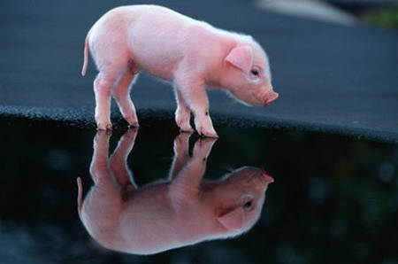 镜子经常被用来测试自我认知能力和高等智慧,大部分婴儿在18-21个月后,可以意识到镜子里面的人是自己。后来,逐渐发现猩猩、大象、海豚和几种鸟也有这个能力。现在有实验证明,猪也能够认出镜子里的自我,并且运用镜子的反射功能观察周围环境,找到食物。猪还会辨认形状,可以同三岁儿童一样把形状相同的木头归纳到一起。现在有研究发现猪经过特训,还学会了使用高科技,会享受计算机游戏,会根据室内温度调节暖气,它们还是唯一能够使用食物自取机的役用动物呢!