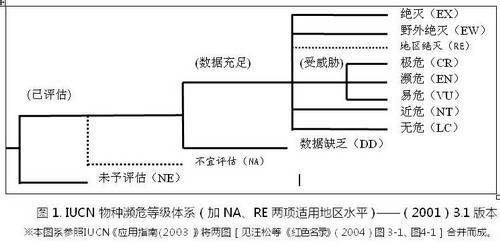 为了实施物种?;?,需要明确物种的生存/濒危状况,首先须建立评定标准。世界自然?;ち耍↖UCN)自1966年起,先后出版了《哺乳动物红皮书》和其它动、植物红皮书,其中提出了濒危物种等级标准,得到国际的广泛认同。在此基础上,为了进一步完善,IUCN对该等级标准进行了多次修订,最主要的版本有两个:①1994年11月IUCN理事会会议正式通过的Mace-Lande物种濒危等级系统,定义了8个等级,分级标准更加明确且有数量观念,《1996 IUCN受威胁动物红色名录》采用了这个等级标准。②2000年2月IUCN理事会通过由SSC(物种生存委员会)修订形成的《IUCN物种红色名录濒危等级和标准(3.1版)》(2001),增加“无危(LC)”而成9级体系,并对“受威胁”3个等级(极危、濒危、易危)分别规定了A-E条量化亚标准;接着又提出《IUCN物种红色名录标准在地区水平的应用指南(3.0版)》(2003),增添了“地区绝灭(RE)”和“不宜评估(NA)”2个等级。图1将IUCN物种红色名录濒危等级体系“应用于全球”和“应用于地区水平”的两个结构综合为一。其中,用楷书–虚线将应用于地区水平时须增加的两级(RE、NA)在总结构中显示出来。去掉这两级就是应用于全球评估的濒危等级体系。