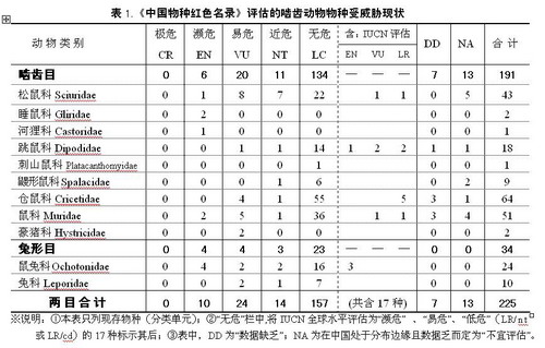 《中国物种红色名录(第一卷)》对啮齿动物共评估了2目11科的225个分类单元(其中,啮齿目依Wilson新系统,将鼯鼠类〈科〉归入松鼠科、林跳鼠类〈科〉归入跳鼠科,仓鼠科的沙鼠亚科转入鼠科,再将鼢鼠类和竹鼠类〈科〉结合而新立鼹形鼠科)。表1列出其评估的分项统计数,由此可知,225个分类单元啮齿动物中,属于濒危、易危占4.44%、10.67%,近危占6.22% ,三者合计占21.33% 。其中,处于“濒?!奔兜模龀菽坑泻永?Castor fiber、沟牙鼯鼠Aeretes melanopterus、林睡鼠Dryomys nitedula、四川毛尾睡鼠Chaetocauda sichuanensis、小狨鼠Hapalomys delacouri和滇攀鼠Vernaya fulva,共6种,兔形目有高黎贡鼠兔Ochotona gaoligongensis、伊犁鼠兔Ochotona iliensis、柯氏鼠兔Ochotona koslowi和黑鼠兔Ochotona nigritia,共4种。至今仅河狸已列为国家Ⅰ级重点?;?,沟牙鼯鼠已列入国“三有”动物保护名单。而“易?!钡?4种,仅巨松鼠Ratufa bicolor、海南兔 Lepus hainanus和塔里木兔Lepus yarkandensis等3种列为国家Ⅱ级重点保护,复齿鼯鼠Trogopterus xanthipes等5种鼯鼠及2种松鼠、2种豪猪列入国“三有”动物?;っァU饩褪撬?,至少还有8个濒危、12个易危物种,已处于“受威胁”状态却尚未列入法定?;っィ凳兑吧锉;しā返娜笨诨瓜嗟贝蟆6饫锝驳氖悄龀荻?,它们乃兽类中增殖和恢复能力特强的类群,所以显示的问题不过是冰山一角?。鄹孟钅孔艿钠拦澜峁牵杭棺刀锸芡玻!⒈粑:鸵孜#┑谋壤?5.92%,接近受威胁(近危)的比例为8.47%;无脊椎动物分别为34.74%和12.44%;裸子植物分别为69.91%和21.23%;被子植物分别为86.63%和7.22%。皆显著高于啮齿动物濒危比例?。?/p>