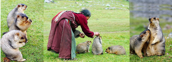 近读西北农林科技大学韩崇选博文(2007)说:“喜马拉雅旱獭自古就生活在丹巴雪山下的草原里,是土地神的宠物。莫斯卡(位于四川丹巴县丹东乡境内)藏民将旱獭奉为神灵,每天都要拿好吃的东西喂这些小宝贝,使这里的野生旱獭融入了牧民的日常生活之中。莫斯卡旱獭通佛性,见人就立身而起,拱掌相拜,是丹巴大雪山下最可爱的野生动物。在藏民看来,万物皆有灵,是化身于雪山、森林、河流与各种各样的野生动物之中的?!蔽闹械南嗥彩翟谖萝埃?/p>