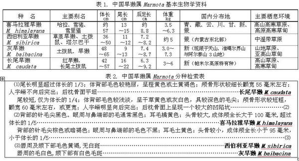 旱獭属已知10余种,分布欧、亚北部和北美;我国有4种,分布西北、西南地区。今据马勇等《啮齿动物分类学与地理分布》(2012),并参考王思博等《新疆啮齿动物志》(1983),将其特征整理成下2表: