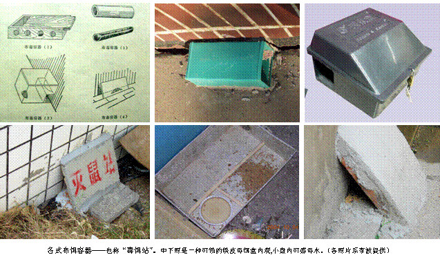 住宅灭鼠,投放方式应当依具体情况确定。一般讲,投毒饵应在下午近黄昏前进行,每堆饵量控制在1、2只鼠当夜能基本吃完为恰当。在人畜不会接触的场所,宜直接投于地面,可减少鼠的疑虑。在天花板、橱顶等高处投放,投饵量可以多一些,如果尘埃不多,可将毒饵直接抛撒进去;否则,可在侧边清扫出小片投放几堆,用硬纸板垫放毒饵靠边推入亦可(但垫纸鼠会生疑,效果要差些)。在容易发生误触误食的地方,应尽量放在隐蔽处,或采用“布饵容器”投放:例如放在两头通的竹筒、塑料管内;或用石板、木板在其上方遮挡——室外可做成较固定的“毒饵站”(见图)?;箍捎檬实贝笮〉闹胶校ㄈ缧校?、木板盒,两端靠边开8厘米大小的洞,将毒饵置于盒内,洞口靠墙贴地便于鼠进出,此称“毒饵盒”。现在市场上有成型的毒饵盒,有的可加锁,适于幼儿园、学校、公共食堂、餐馆、车间等处长期控制鼠害使用。采取这些装置,难免增加鼠的疑虑,会有多日忌避,不进入、不取食。可在盒外放些未加药的同类诱饵引导其取食,待它吃顺后,还是会进來,且会更安心取食。使用毒饵盒,重要的是定期检查,及时补充、更换毒饵,谨防空缺、霉坏。长年放置的,应有专人每半月检视1次。