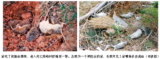鼠取食第一代抗凝血毒饵,通常会在5天左右出现中毒症状和死亡高峰。但现今家鼠耐药性渐增,我们常听到反映说投毒饵半个月不见鼠死。对此要有耐心,这些顽鼠一般熬不过1个月。若投放20天以上仍然取食,应再投几天;或换用第二代抗凝血灭鼠剂,也可改用鼠夹或鼠笼捕打。