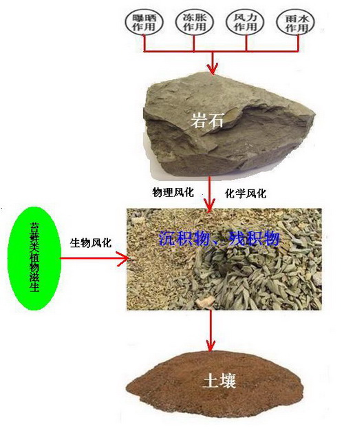 我以前是一块大大的石头,每天太阳升起后,把我的身体晒得滚烫,晚上寒风吹过,我的身体不由的收缩。因为我是热的不良导体,所以在这种冷热交替的环境中,我的身体慢慢的一层一层的剥落(这就是人们说的物理风化)。大气中的二氧化碳溶入雨水中,造成弱碳酸。这些酸使我身体中的矿物质发生化学分解作用,产生新的物质(也就是化学风化)。我在物理风化和化学风化的作用下风化成了一堆疏松的风化壳。风化壳在重力、流水、风力等作用下被迁移形成崩积物、冲积物、?;?,它们被统称为运积母质?;褂胁糠莘缁橇粼诹嗽?,形成残积物,人们把它称为残积母质。