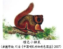 小鼯鼠Petaurista elegans(Temminck,1839):英语名 Lesser giant flying squirrel,系体长30~40厘米左右的中型鼯鼠。外形基本特征是:尾长超过体长,耳基部无黑色长毛簇,眼周有色圈。体背部毛色较浅淡,基调呈灰或灰褐色,无纯白色毛斑;耳后部比背部毛色鲜艳,形成橘色或土黄色毛斑;腹部毛杂有橘黄色调;足背毛橙黄色。为热带种类,主要分布马来亚、印尼加里曼丹、缅甸、老挝和越南等地;中国为次要分布区,主要见于西南部。