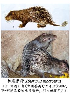 扫尾豪猪Atherurus macrourus(Linnaeus,1758):别名刷尾豪猪、刺猪、扁毛猪,英文名Asiatic Brush-tailed Porcupine。体型较小,体重约2.5千克,体和尾均较长,尾长超过后足长的2倍。四肢短而粗壮,耳廓短而圆。全身几乎都被覆扁形短棘刺,刺上有沟;颈项无鬣毛,背部刺间有污白色毛。体深褐色,体腹色较浅,其棘刺柔软纤细。尾显露于棘刺之外,长而有鳞,尾末端覆有浅黄色刷状软棘簇,棘的后部具有2~4个膨大的细小扁椭圆囊,大小似米粒。爪粗短,略弯曲。