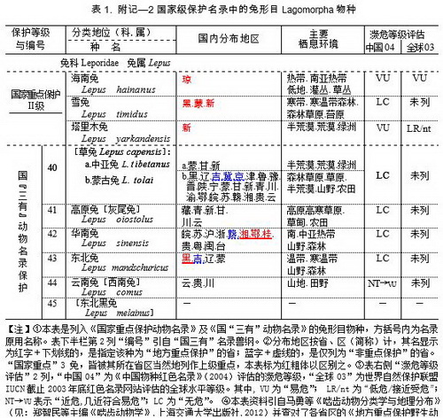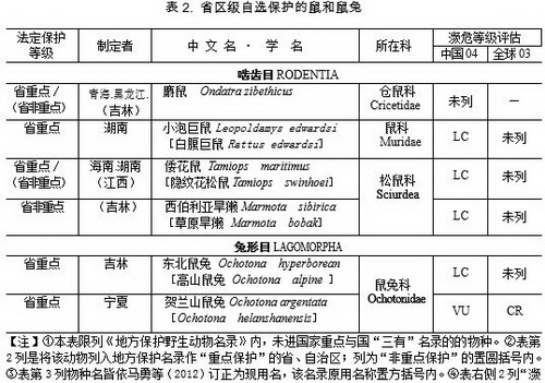 现于表2列出这些未进国家2名录,乃由各省区自行选定?;さ?鼠2鼠兔。其中,吉林列的旱獭和麝鼠、江西(1995)列的“松鼠科所有种”,都是定为非重点?;?,层级较低。为同国际接轨,凡属、种名已变更的也都改用现行名称,将该名录原用名置方括号内。