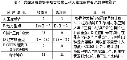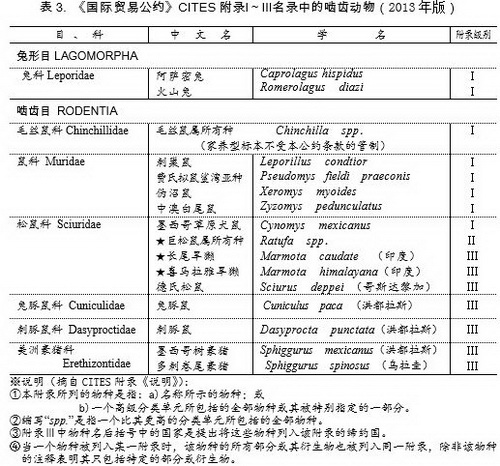 表3给出2013年版(2013年6月12日生效)所列的兔形目和啮齿目完整名单。由该表可知,啮齿目与兔形目列于附录Ⅰ,今归国家Ⅰ级?;さ挠忻渴笫簦ㄋ兄郑?、阿萨密兔等4科8个种类;列于附录Ⅱ有“巨松鼠属(所有种)”,原先国家Ⅱ级?;ひ丫杏芯匏墒螅掷┱刮?;列入附录Ⅲ的,现有4科7种,其中由成员国印度提出的长尾旱獭与喜马拉雅旱獭,依条约“在中国有分布,同时受所属附录的限制”——按《公约》规定,我国必须协同该列入国(印度)查验进出口许可证,合作控制此2物种贸易。