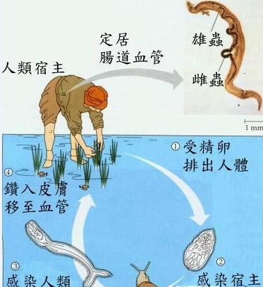 3)接触疫水的方式:在村庄附近的水体、船只停泊地点以及人畜经常活动的地方,钉螺的血吸虫感染率常较高。当水体中存在感染血吸虫的阳性钉螺时,便成为疫水。人们因生产 (捕鱼、摸蟹、割湖草、种田、放牧、水利建设、抗洪抢险等) 或生活(洗手、洗脚、游泳、洗衣物等) 接触疫水而感染。在有钉螺的草地上的露水中也可有尾蚴,赤足行走也可感染。饮用被污染的生水,尾蚴可从口腔黏膜侵入。身体大面积接触疫水常导致急性感染。频繁地小面积接触疫水的患者多呈慢性病程。