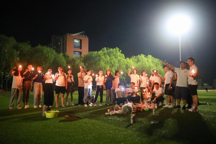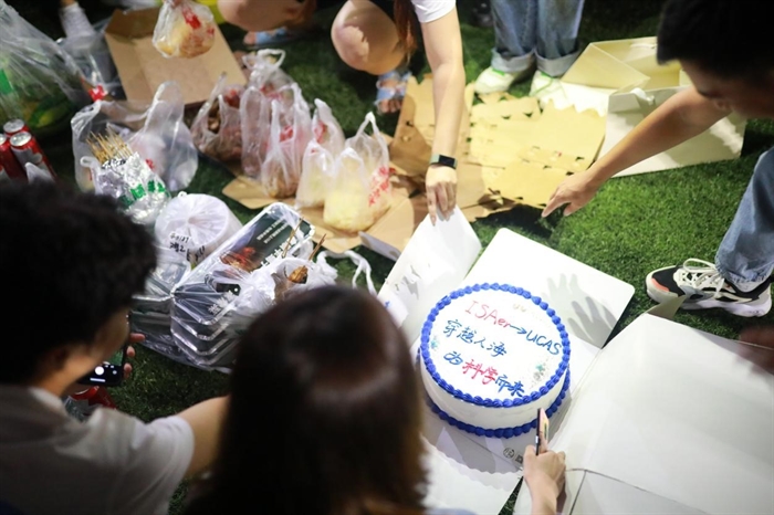 同学们身着所服三五成群,成为国科大一道靓丽的风景。晚上八点,学校东区田径场灯火通明,大家围坐一圈,通过小游戏进行自我介绍,其中更有机械舞等不同才艺展示,气氛逐渐活跃当写有“ISAer到UCAS 穿越人海,为科学而来”的蛋糕被惊喜端出时,现场气氛到了最高潮。现场欢笑不断,直到夜幕渐深大家才兴尽而归。