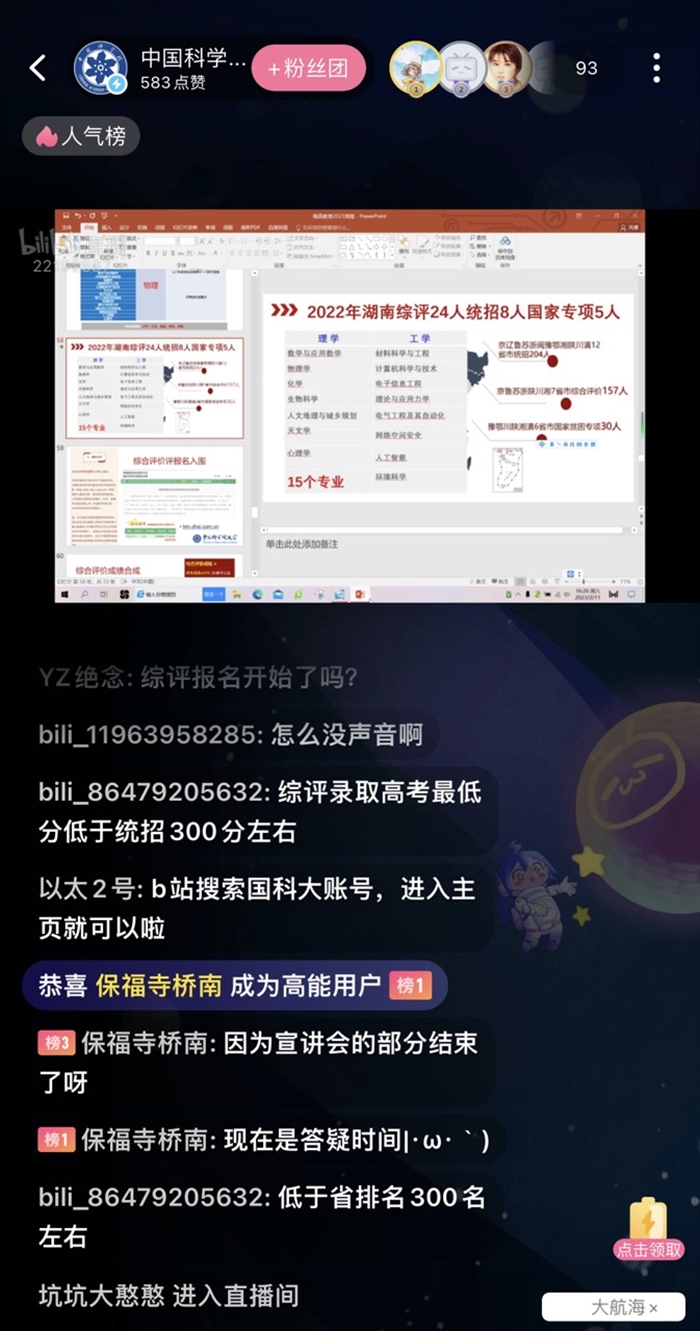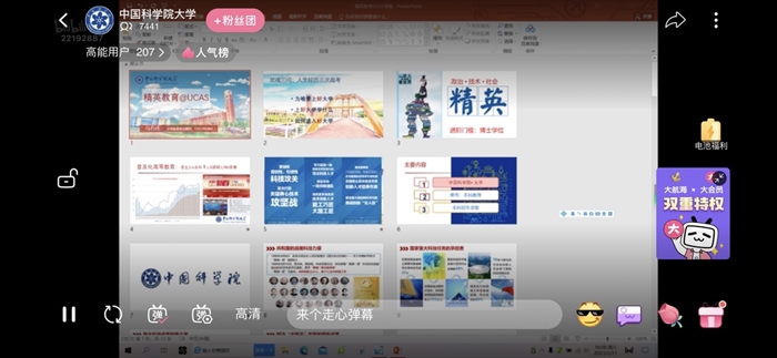 马石庄首先对中国科学院、国科大做了简要介绍,并围绕国科大的人才培养理念、丰富校园生活、在读学生尤其是湘籍在读国科大学子的成长和在湘招生政策进行了详细介绍和讲解。宣讲结束后,国科大招办老师和湖南招生组成员也通过B站和微信群与考生及家长进行互动交流,着重回答了考生和家长们关心的录取政策、招生对象、申请条件、考核标准及出国留学政策等。