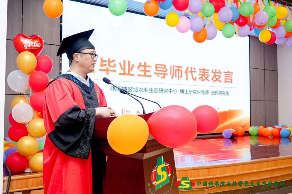 喀斯特区域农业生态研究中心博士研究生导师张伟作为导师代表发言。他向同学们分享了自己一路走来的个人感悟,鼓励同学们脚踏实地、不断进步,在新的征程中砥砺前行、踔厉奋进,不负时代不负韶华。